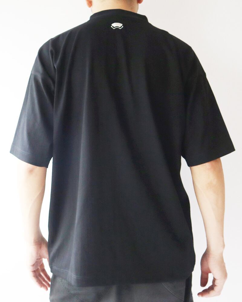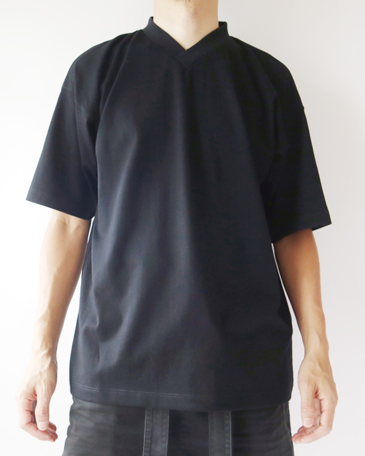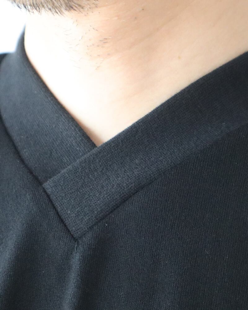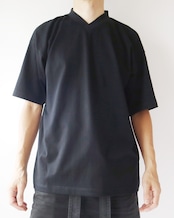 肉厚で肌触りの良い綿素材使用した大きな作りの半袖カットソー。直線的なゆったりとした裁断は肉体の輪郭をあまり強調しないシルエットを作り出し、肉厚の素材と相まって透けにくい仕様になっている。V字の襟は着物の前合わせのような首元を演出しており、羽織と合わせると着物のを重ね着したような独特な表情を作り出すことが出来、無地でも充分存感のある一枚に仕上がっている。
