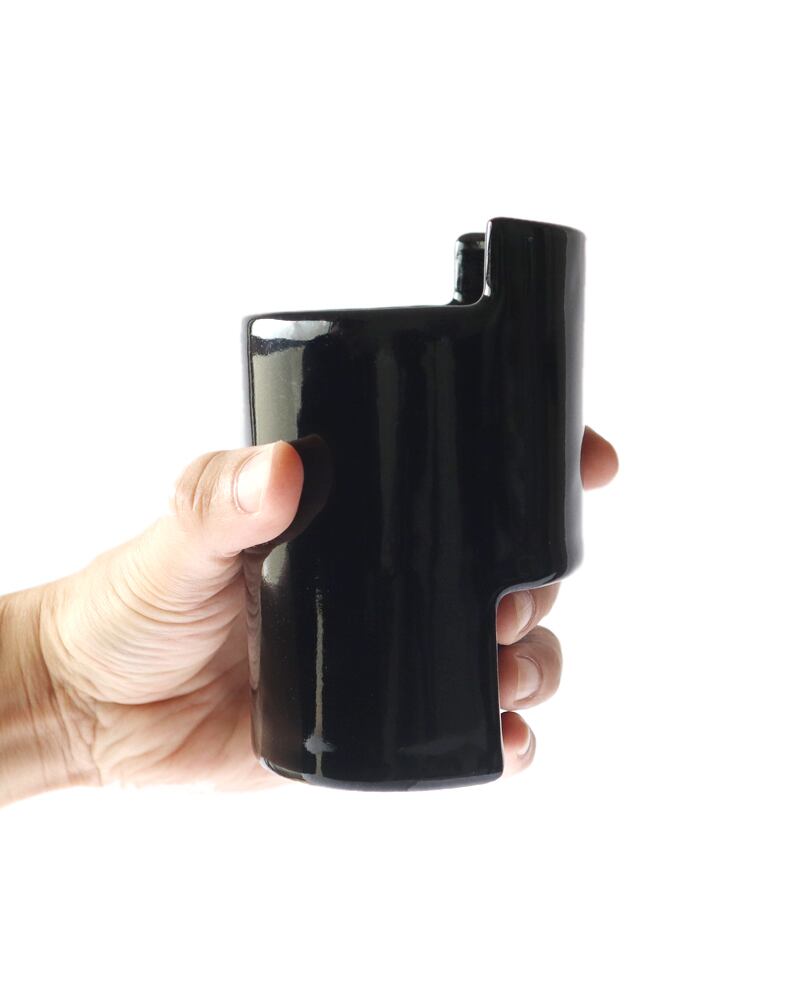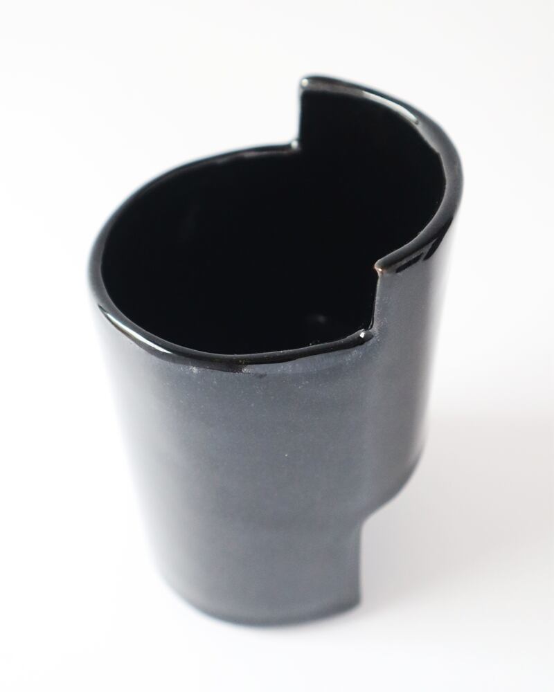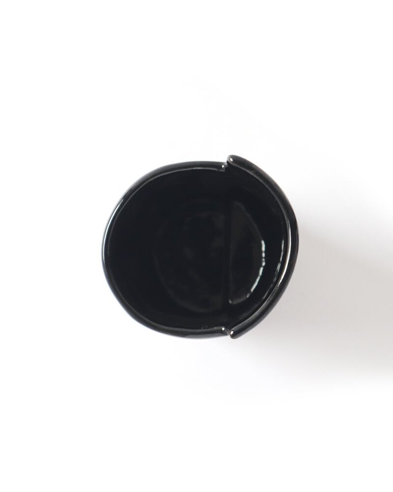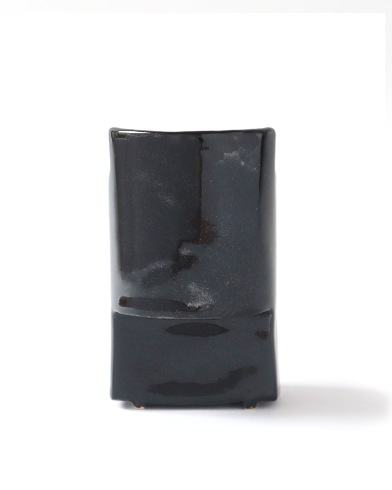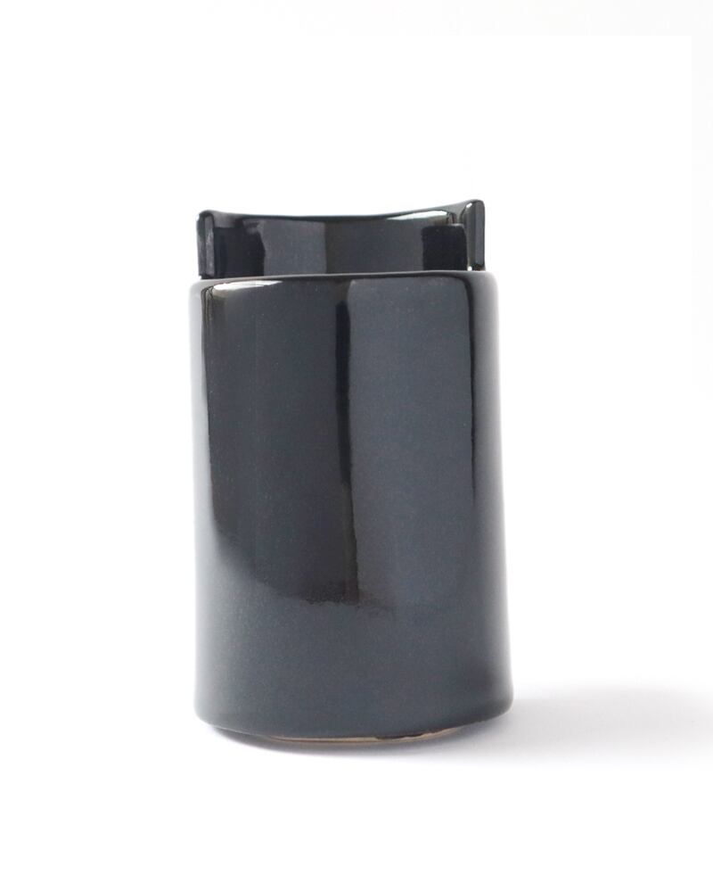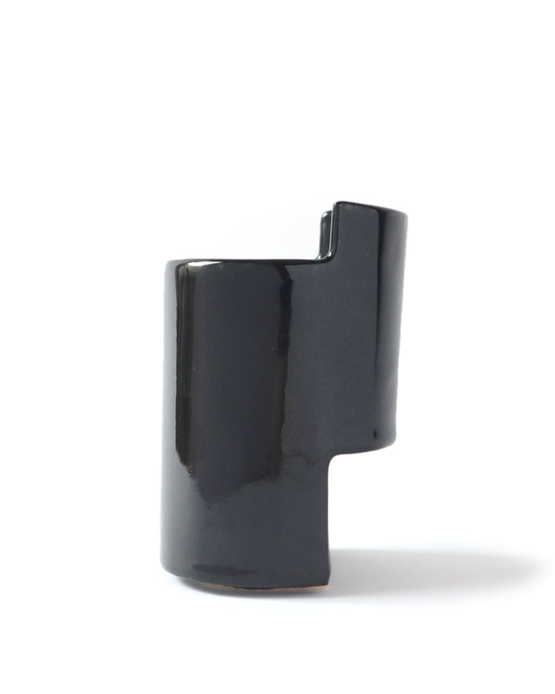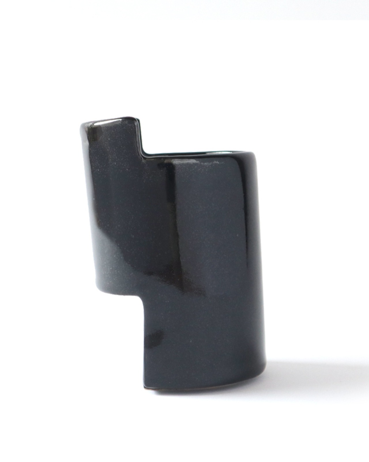 縦に斬り落とされた造形が特徴的な湯呑。縦に走る切り口が程良い緊張感を生みながらも、直線と曲線の調和が自然と掌に馴染む。真正面から向き合う潔い姿勢を落とし込んだ、意思のある佇まいの一客。