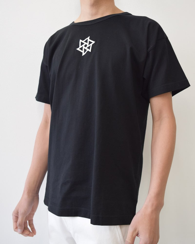 着物のように直線的な裁断で構築された半袖カットソー。平面的なデザインで大振りな寸法取りをしているため、肉体の輪郭をあまり強調しないゆったりとしたシルエットと着心地が特徴。